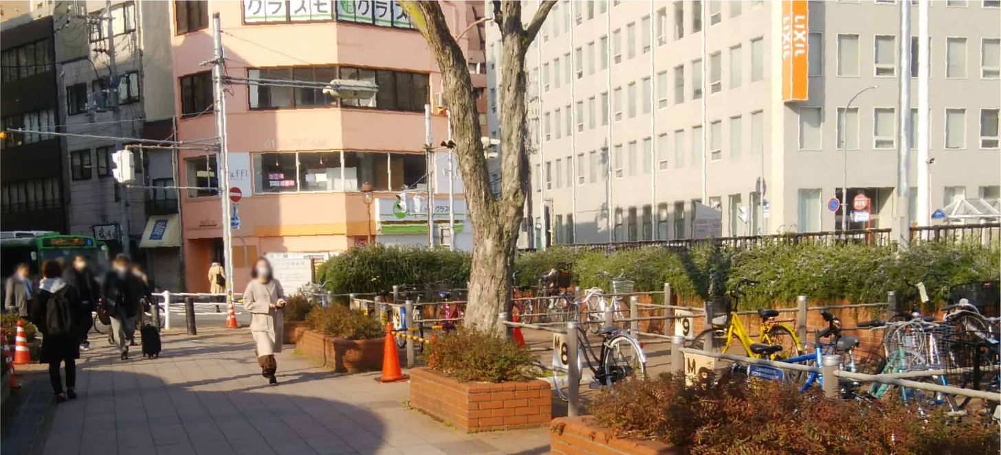 ② 下記の写真の矢印のビルを目指して歩きます。